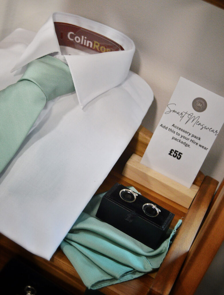 with £55 which includes any shirt, tie and pocket and cufflinks.